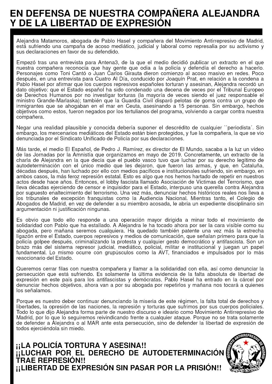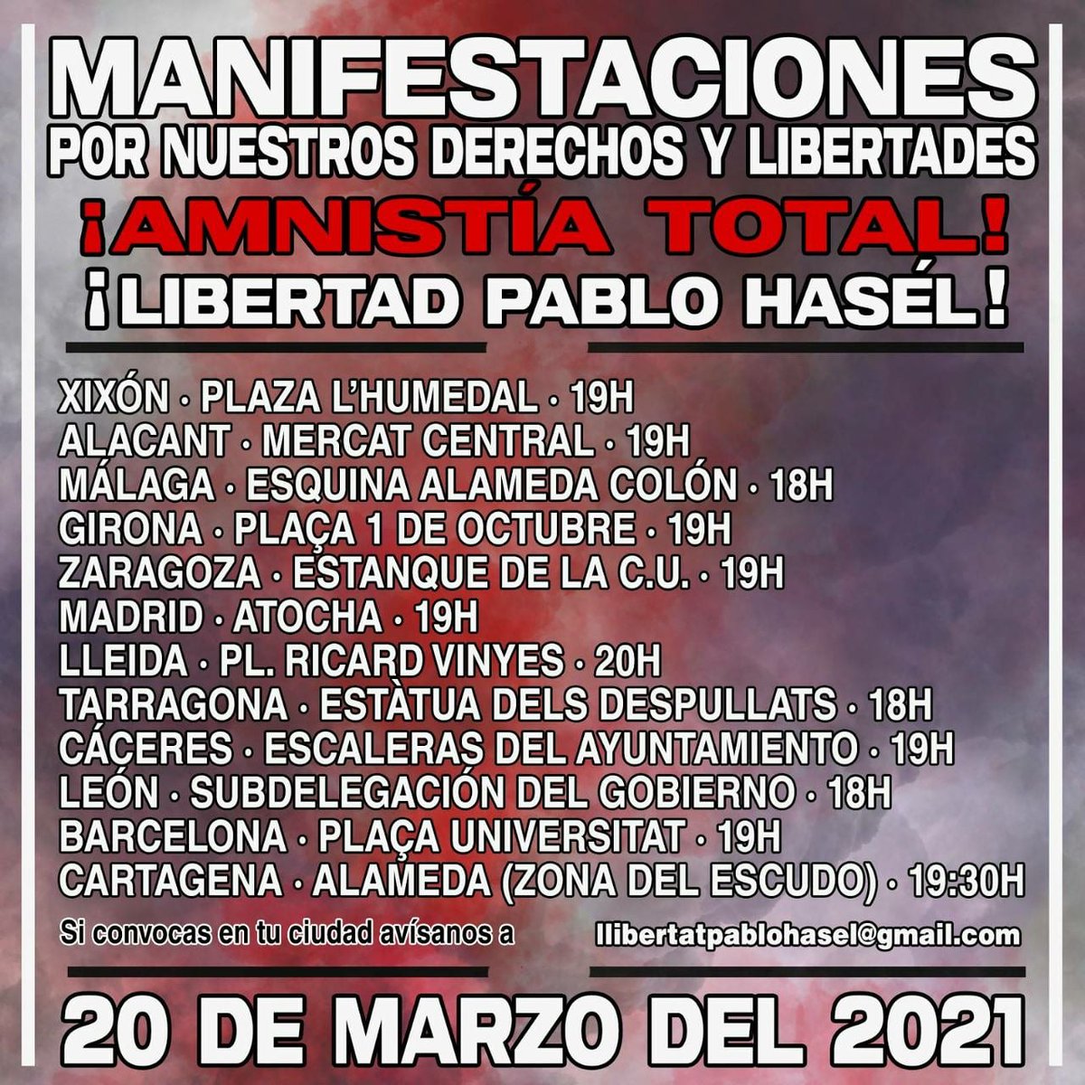 18 marzo, 2021 General MANIFESTACIONES ESTATALES POR NUESTROS DERECHOS Y LIBERTADES 20M21 Posted by Asociación Germinal Manifestaciones Estatales por Nuestros Derechos y Libertades 20M21. #20MAmnistiaTotal. Libertad Pablo Hasel! Actualizado 17.3.21 Etiquetas: convocatoria Publicado por Pablo Heraklio en 19:27 #20MTodosALasCalles #20MAmnistiaTotal En Defensa de Nuestra compañera Alejandra Prnt / PDF