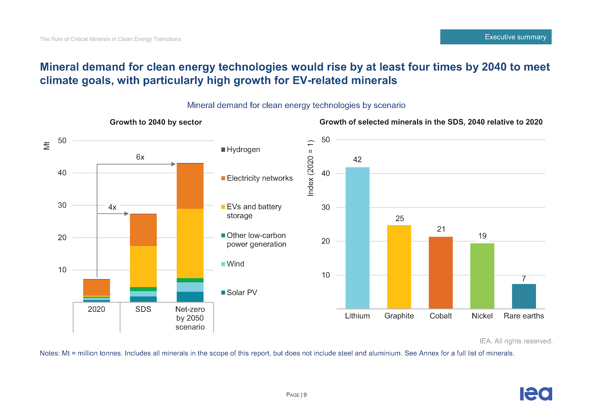 El tema de la escasez de materiales críticos para la transición renovable es muy conocido desde hace bastante tiempo. Hace unos días, la Agencia Internacional de la Energía (AIE) sacó un informe sobre estos materiales, en el cual se mostraban algunas cosas curiosas. La más destacada, estas gráficas, sobre todo la de la derecha.